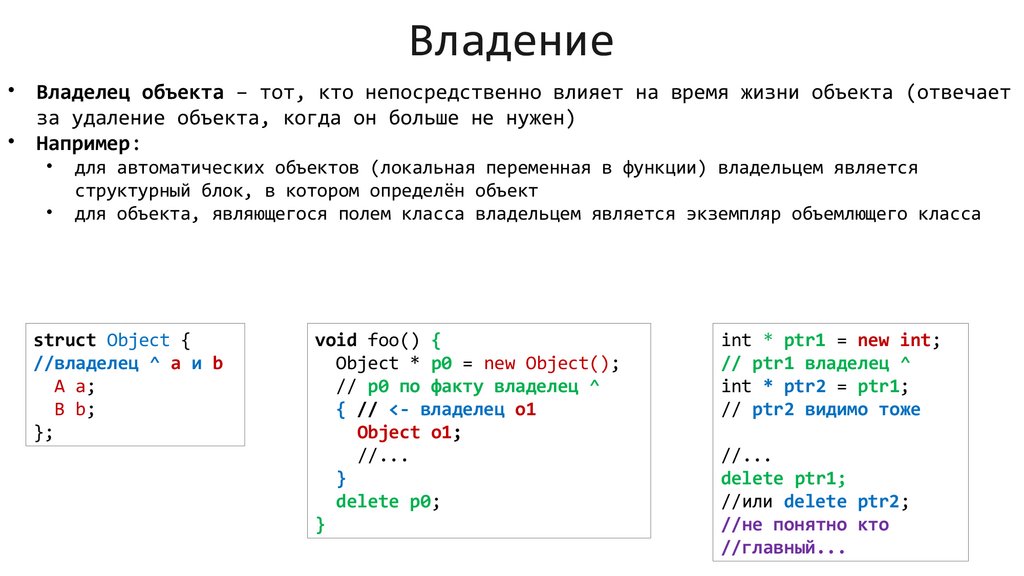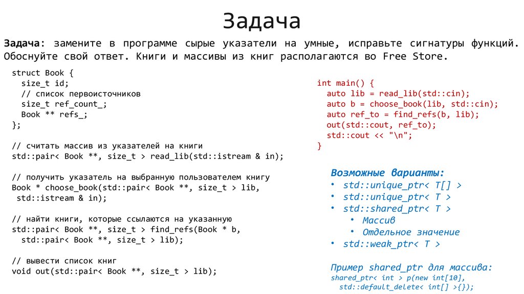 ЗадачаЗадача: замените в программе сырые указатели на умные, исправьте сигнатуры функций.