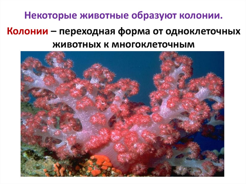 Некоторые животные образуют колонии.Колонии – переходная форма от одноклеточных