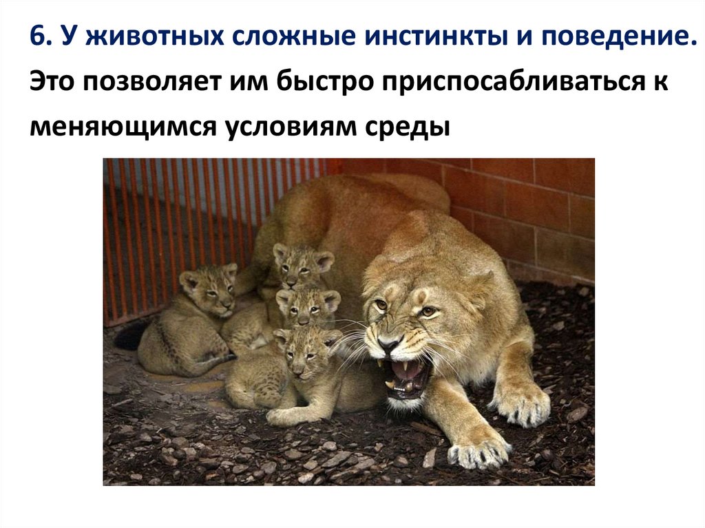 6. У животных сложные инстинкты и поведение.Это позволяет им быстро приспосабливаться к