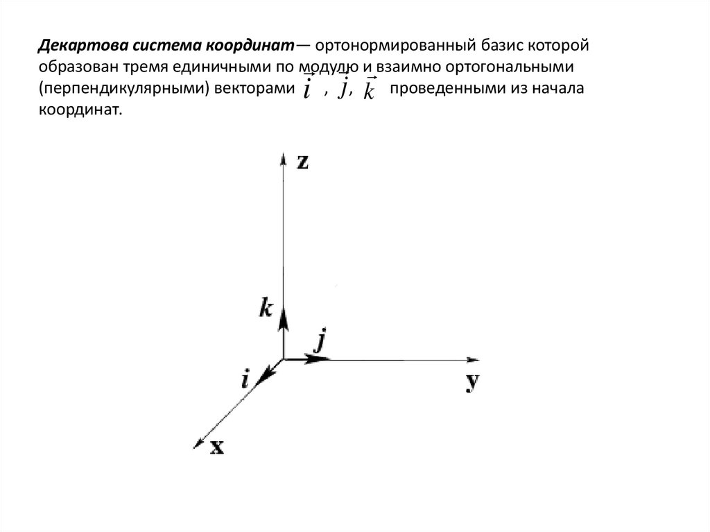 Декартова система координат— ортонормированный базис которойобразован тремя единичными по модулю