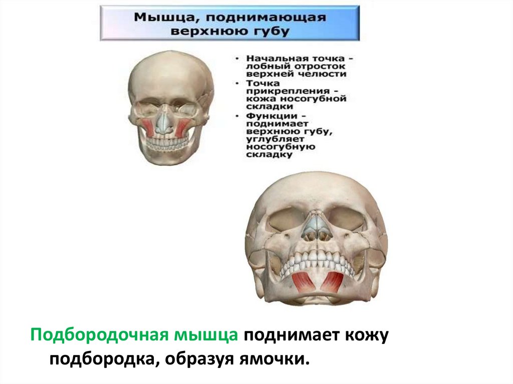 Подбородочная мышца поднимает кожуподбородка, образуя ямочки.