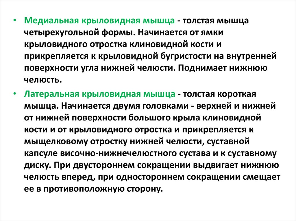 • Медиальная крыловидная мышца - толстая мышцачетырехугольной формы. Начинается от ямки
