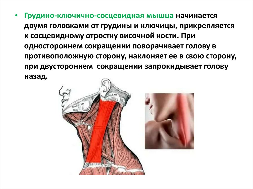 • Грудино-ключично-сосцевидная мышца начинаетсядвумя головками от грудины и ключицы, прикрепляется