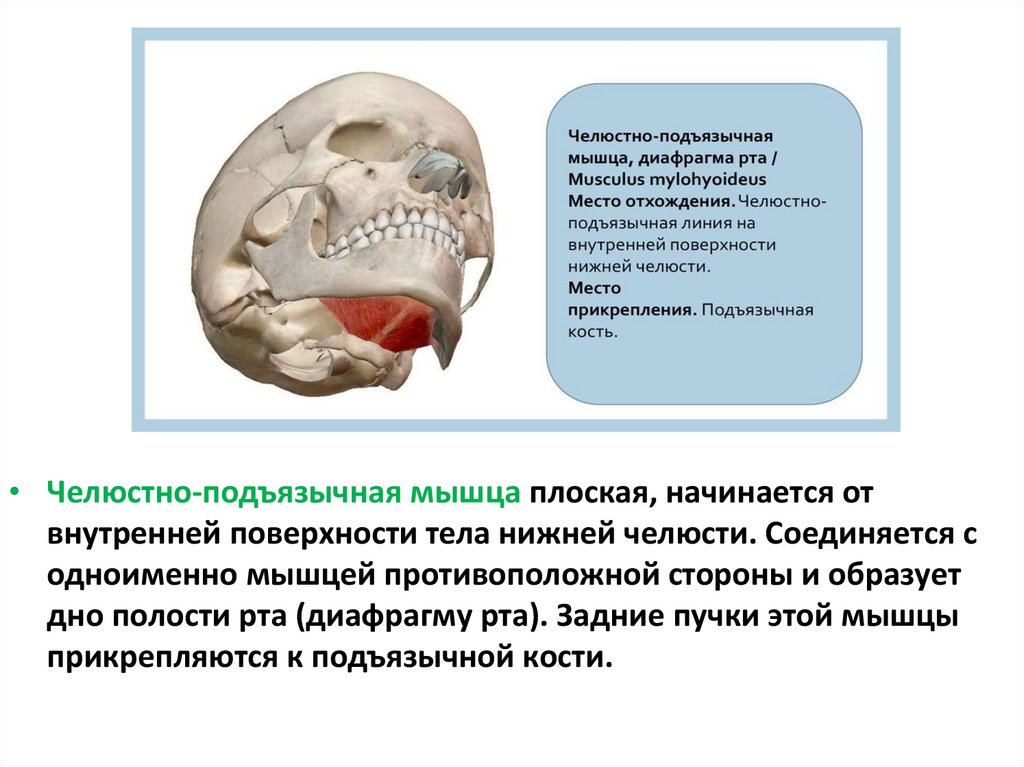 • Челюстно-подъязычная мышца плоская, начинается отвнутренней поверхности тела нижней челюсти. Соединяется с