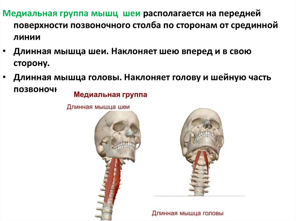 Медиальная группа мышц шеи располагается на переднейповерхности позвоночного столба по сторонам от срединной