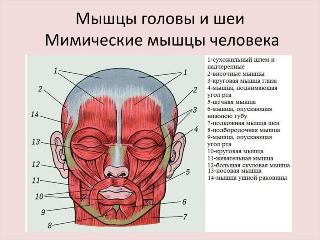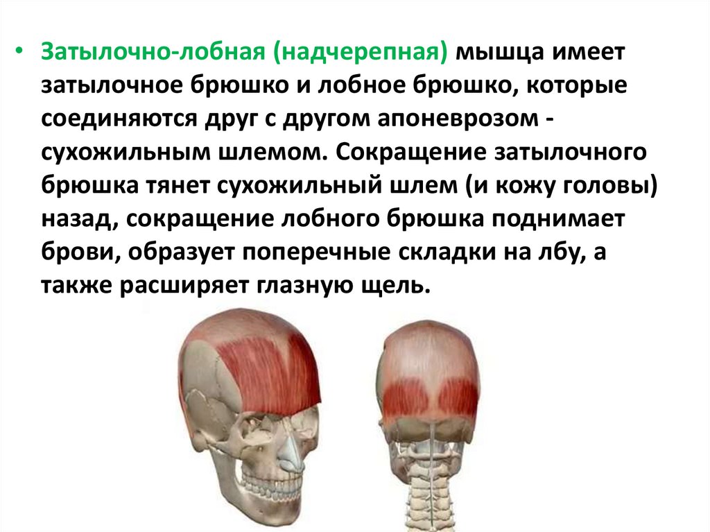 соединяются друг с другом апоневрозом сухожильным шлемом. Сокращение затылочного