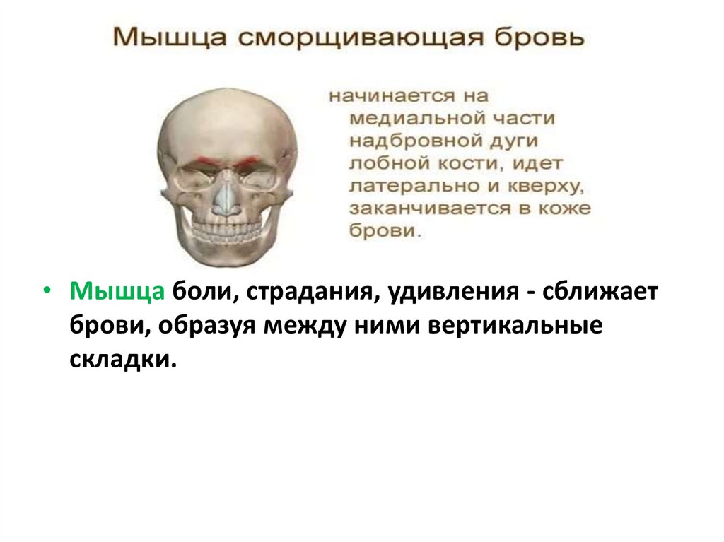 • Мышца боли, страдания, удивления - сближаетброви, образуя между ними вертикальные