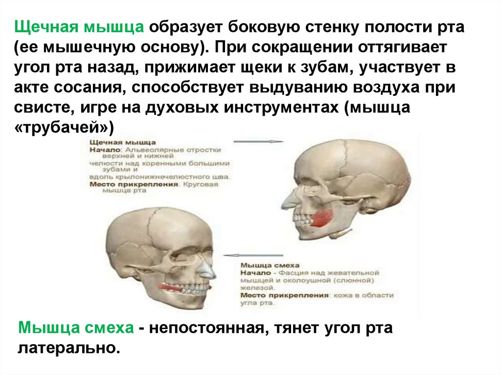 Щечная мышца образует боковую стенку полости рта(ее мышечную основу). При сокращении оттягивает