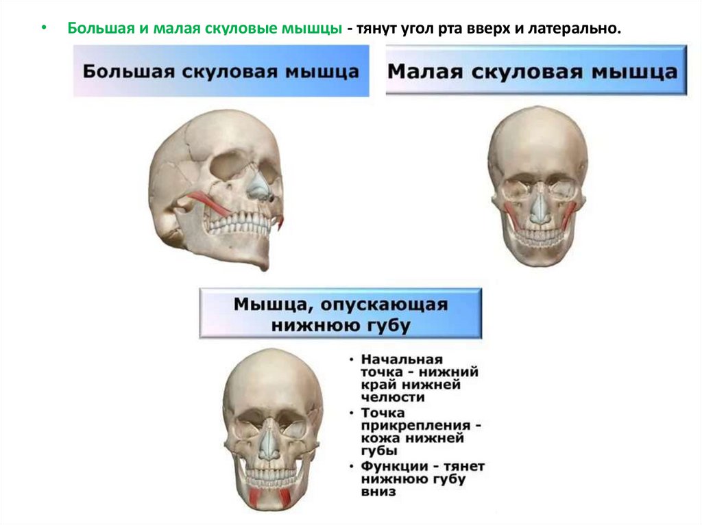 Большая и малая скуловые мышцы - тянут угол рта вверх и латерально.