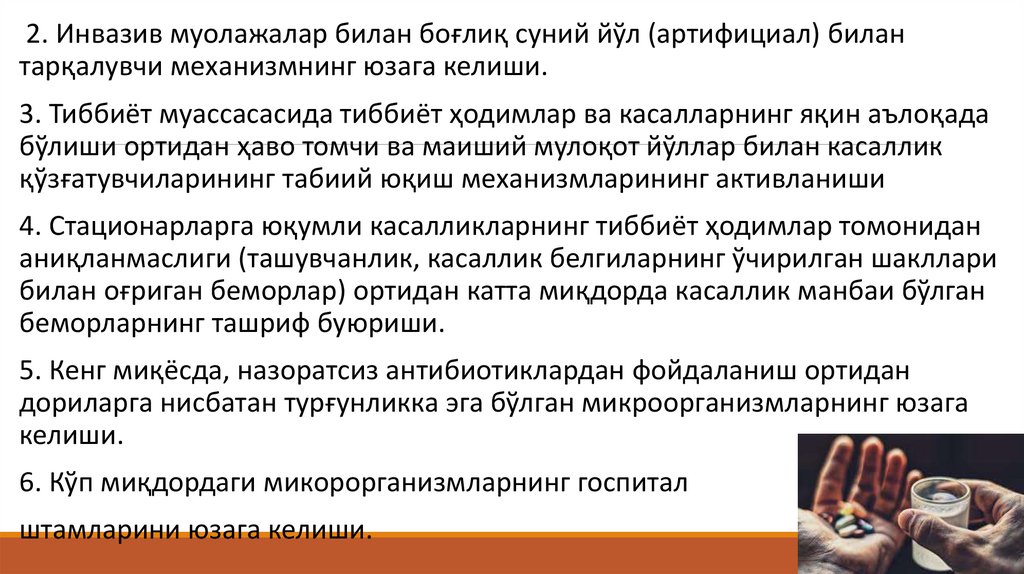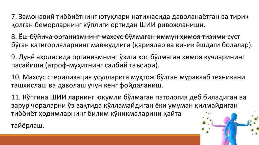17. Шифохона ичи инфекцияларининг ўсишига таъсир қилувчи омиллар