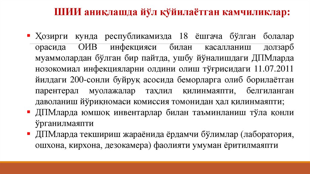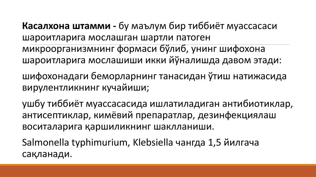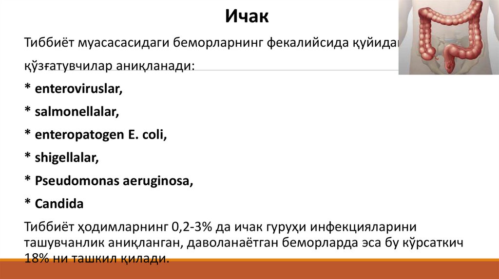 Маълумотларга кўра Тиббиёт муасасасига даволаниш мақсадидаётқизилган беморларнинг 5-10% да шифохона ичи инфекцияси билан