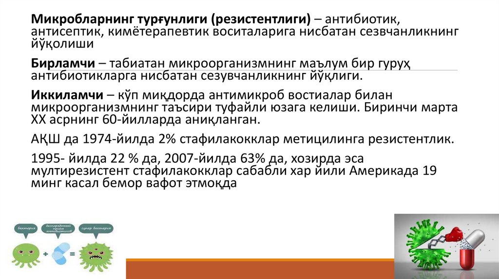 ХХ асрнинг 40-йилларга келиб антибиотик ва кимётерапиявоситаларига чидамли бўлган шифохона ичи инфекцияларини келтириб