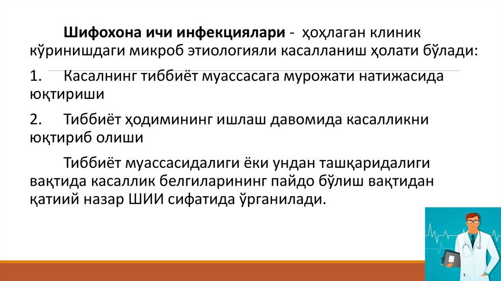 Шифохона ичи инфекциялари - ҳоҳлаган клиниккўринишдаги микроб этиологияли касалланиш ҳолати бўлади: