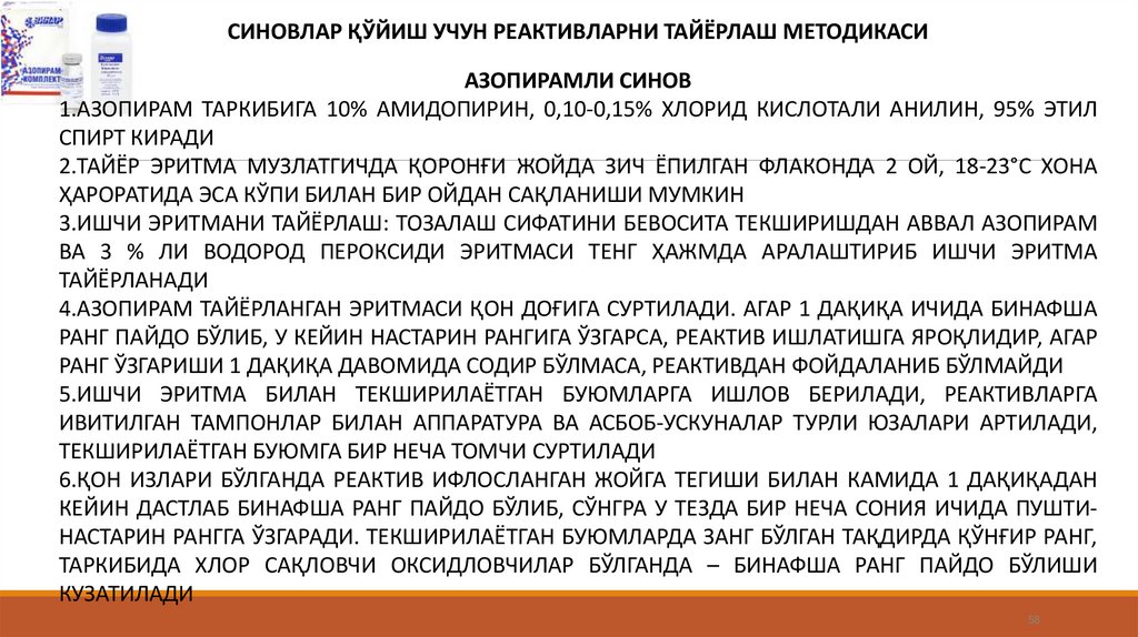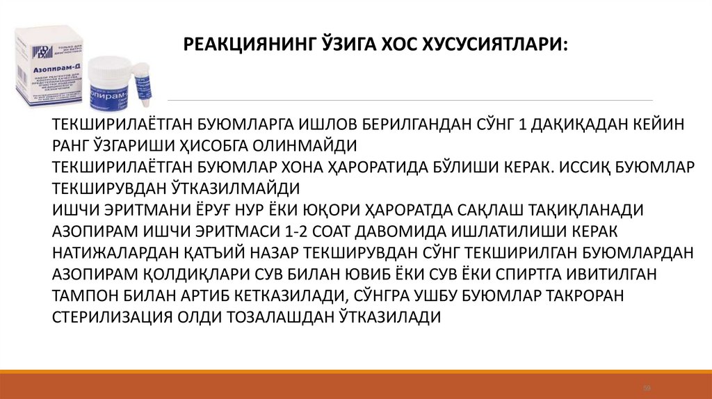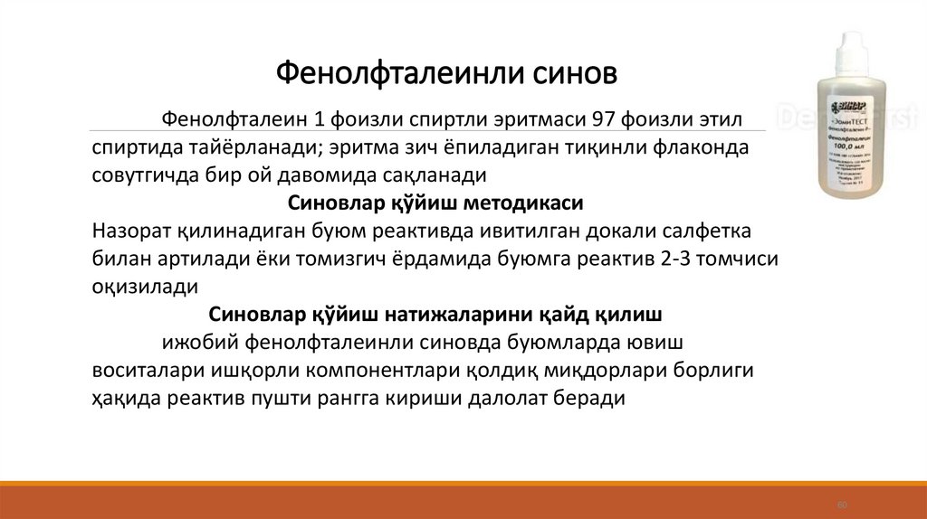 таркибида хлор сақловчи, водород пероксиди ёки бошқа дезинфектантлар мавжуд бўлади.
