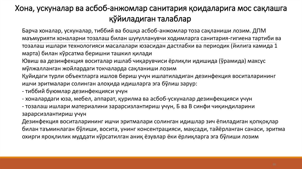 Эслатма: Дезинфекция воситаларни ҳар ҳафта алмаштирилиб қўллаш тавсия қилинади: