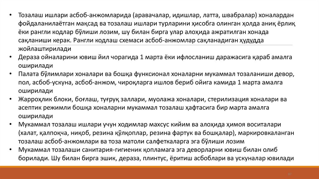 • Палата бўлимлари хоналари ва бошқа функсионал хоналарни мукаммал тозаланиши девор,