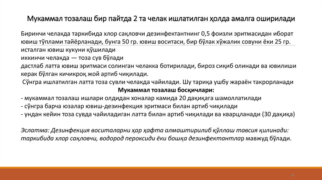Мукаммал тозалаш бир пайтда 2 та челак ишлатилган ҳолда амалга ошириладиБиринчи челакда таркибида хлор сақловчи дезинфектантнинг 0,5 фоизли эритмасидан иборат