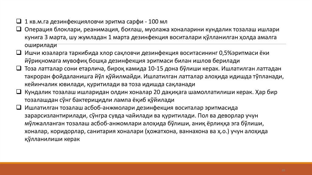 1 кв.м.га дезинфекцияловчи эритма сарфи - 100 млОперация блоклари, реанимация, боғлаш, муолажа хоналарини кундалик тозалаш ишлари