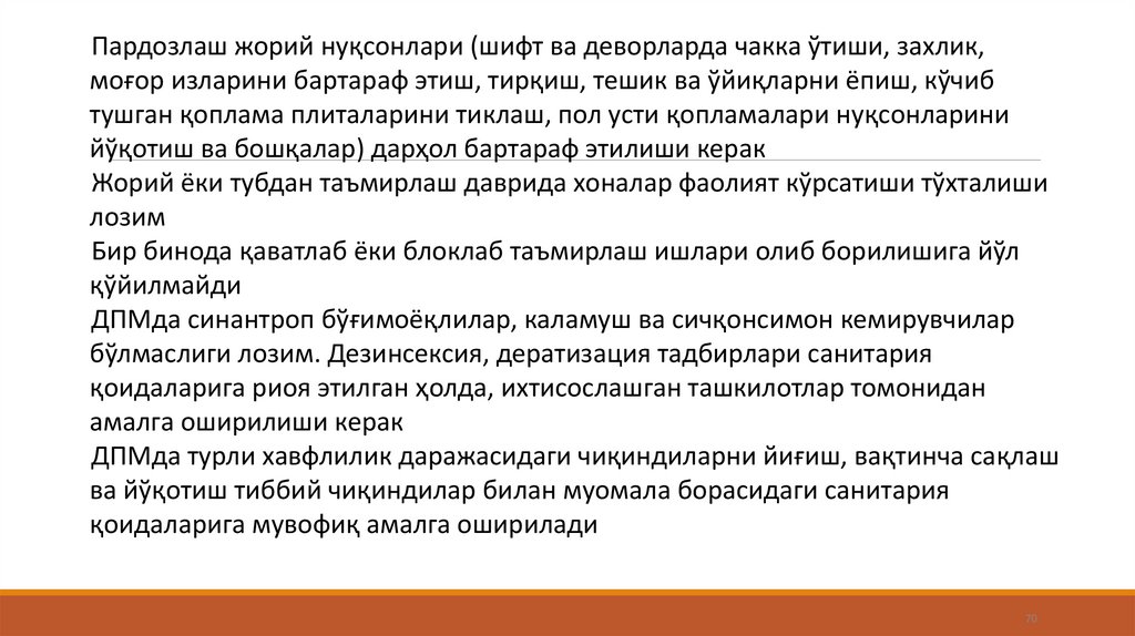 бўлмаслиги лозим. Дезинсексия, дератизация тадбирлари санитария