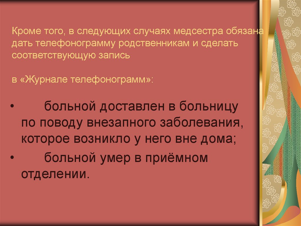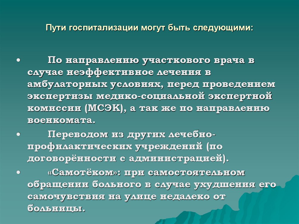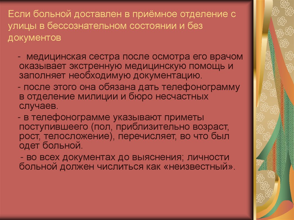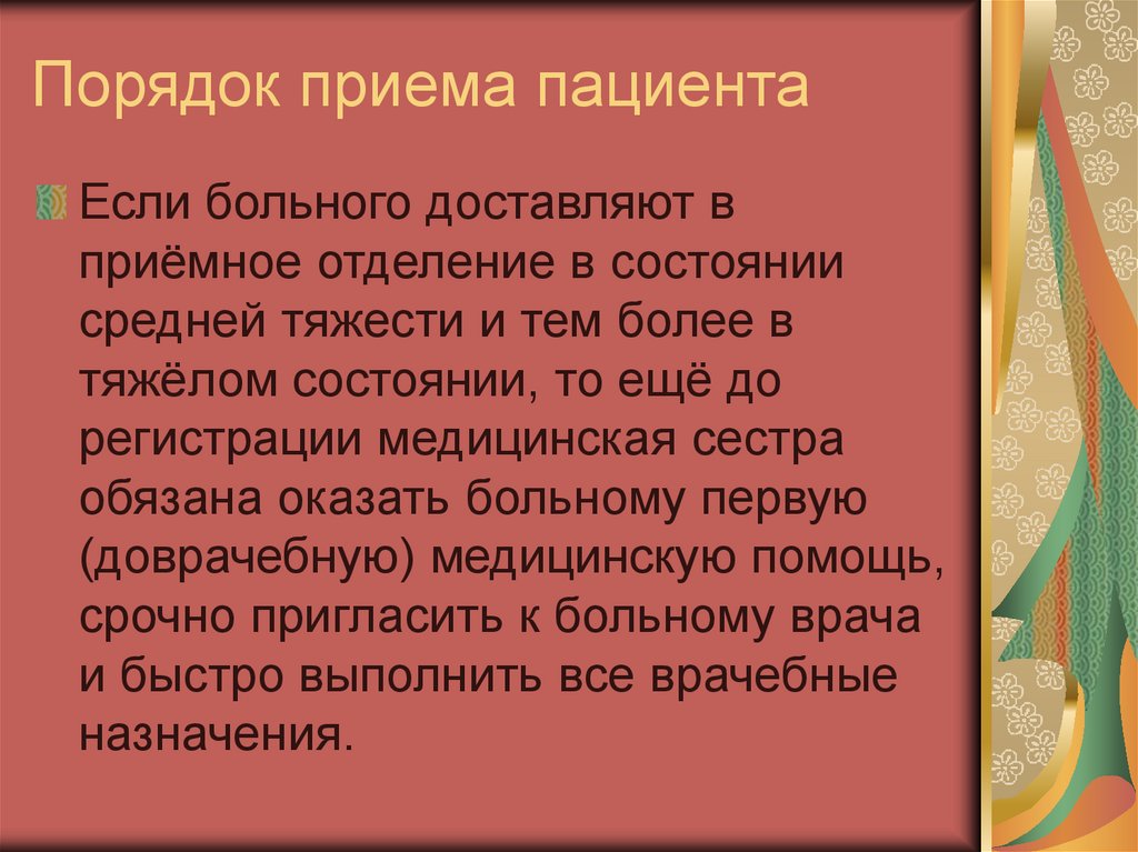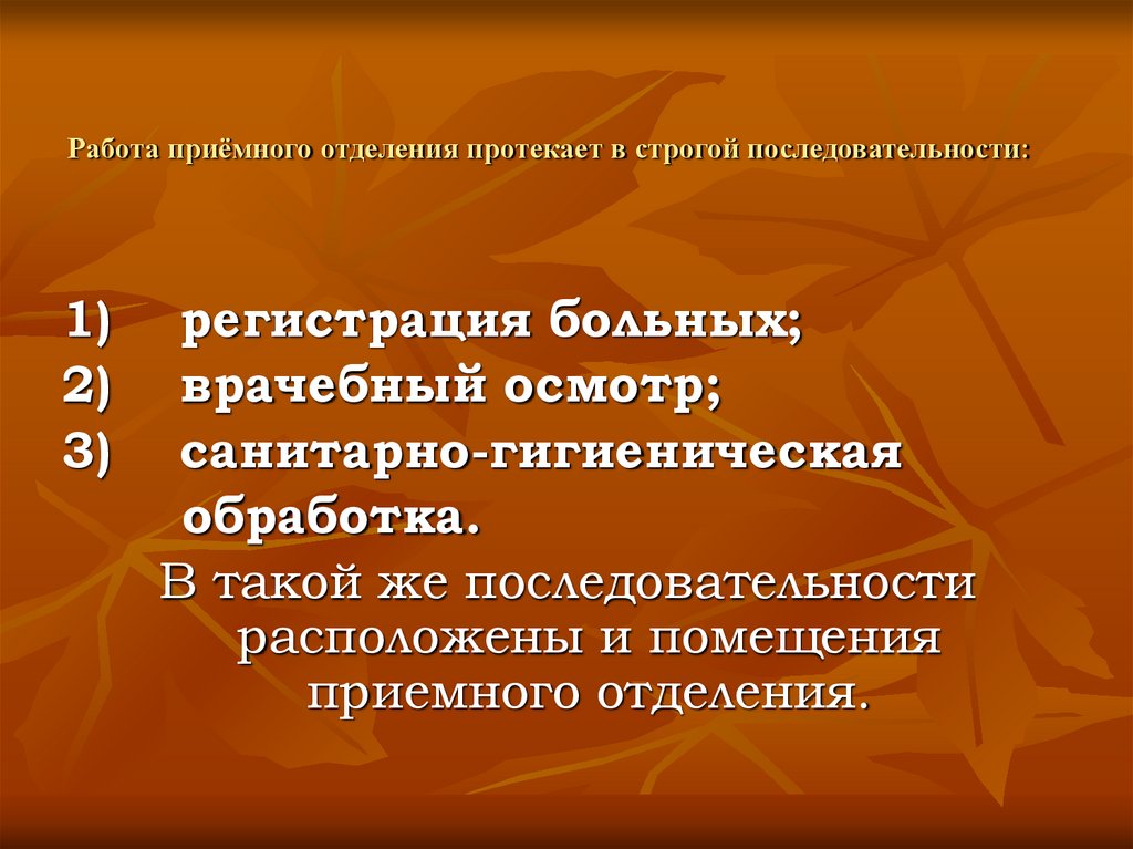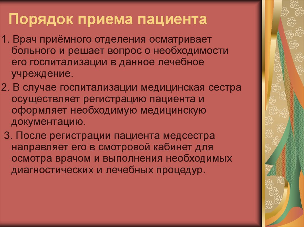 Работа приёмного отделения протекает в строгой последовательности:1)