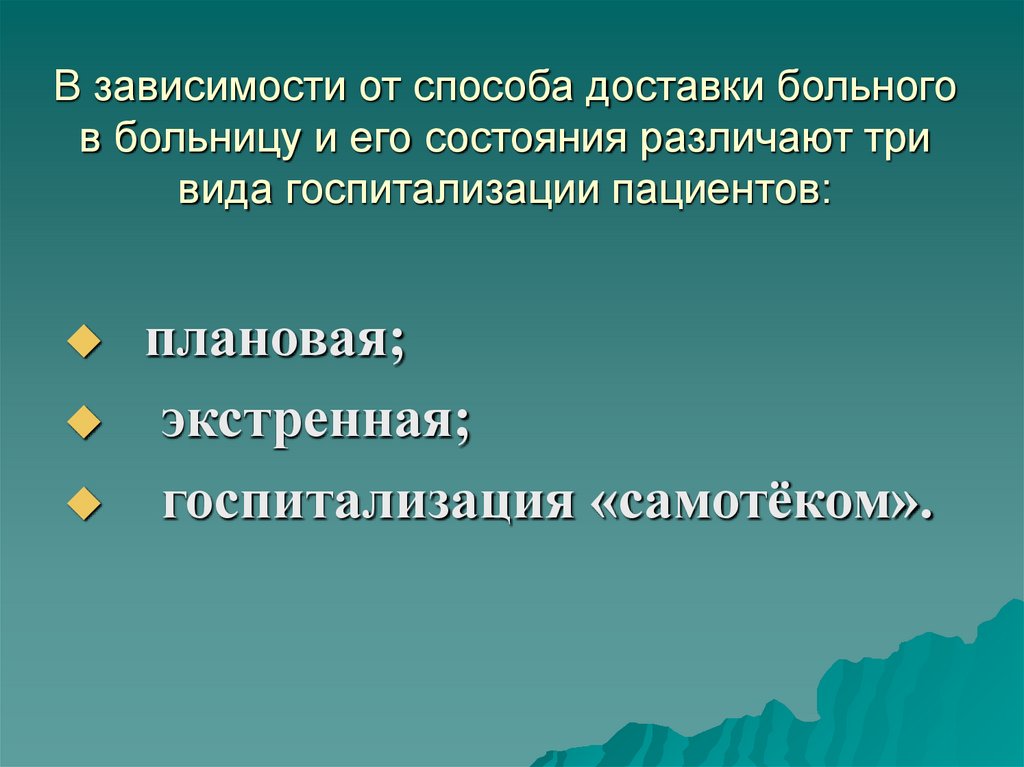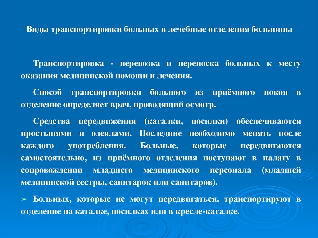 Виды транспортировки больных в лечебные отделения больницыТранспортировка - перевозка и переноска больных к месту