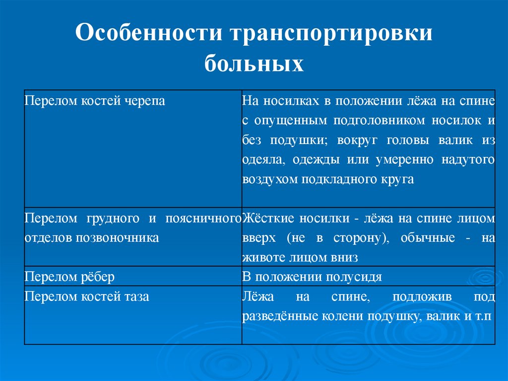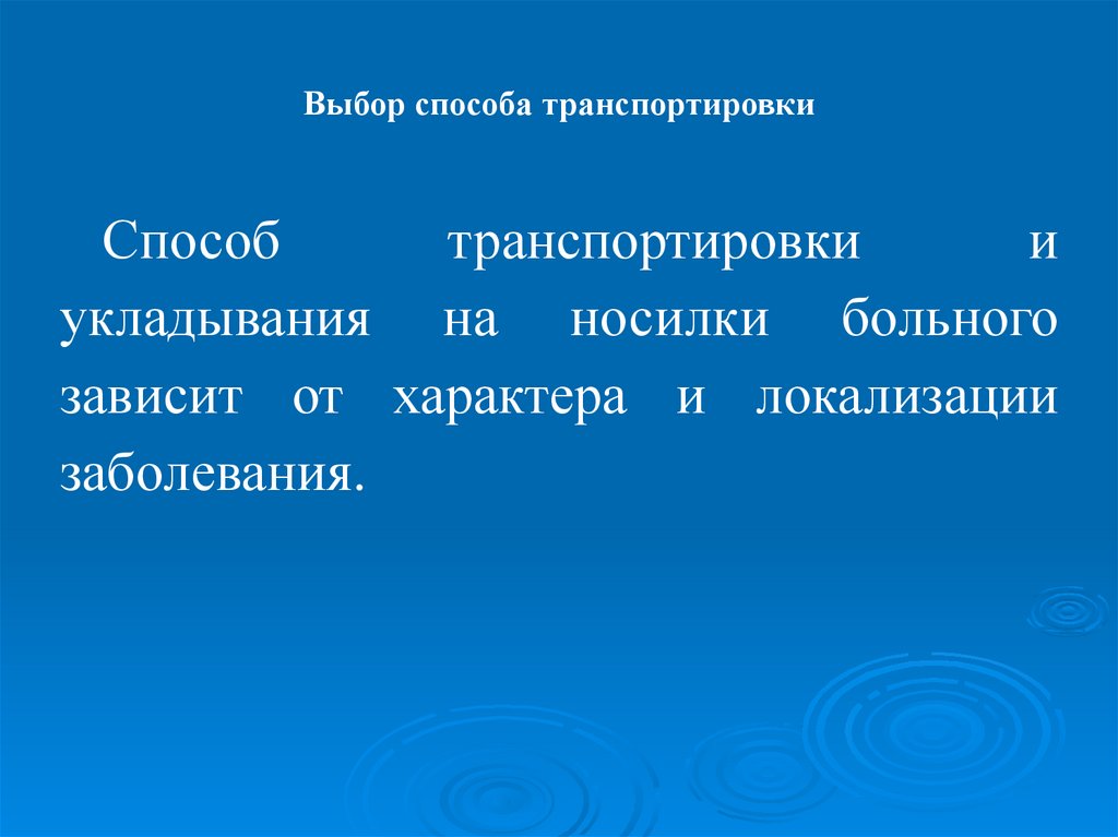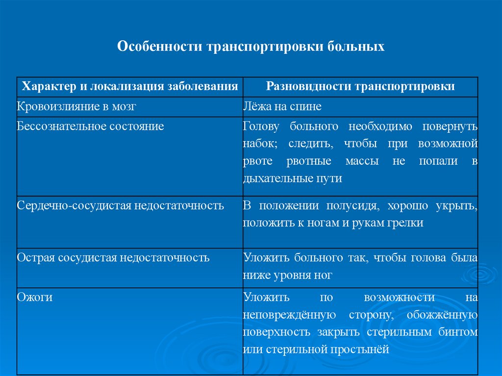 Особенности транспортировки больныхХарактер и локализация заболевания
