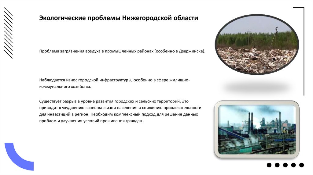 Экологические проблемы Нижегородской областиПроблема загрязнения воздуха в промышленных районах (особенно в Дзержинске).