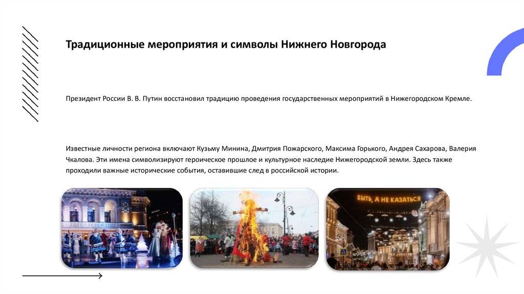 Традиционные мероприятия и символы Нижнего НовгородаПрезидент России В. В. Путин восстановил традицию проведения государственных мероприятий в Нижегородском Кремле.