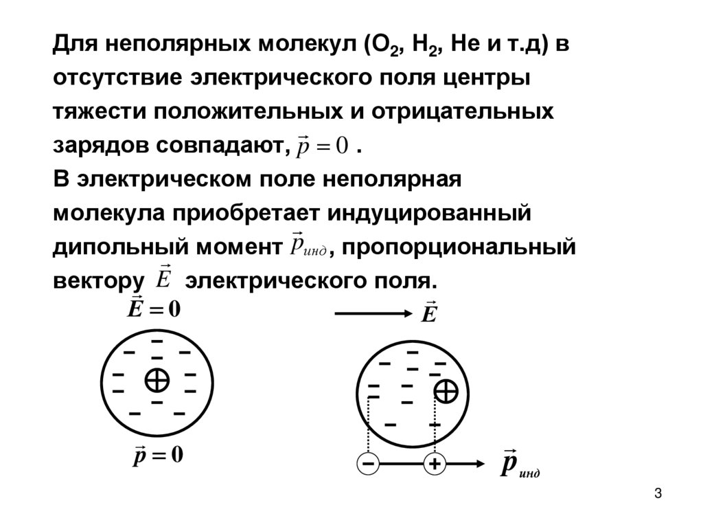 Для неполярных молекул (О2, Н2, Не и т.д) вотсутствие электрического поля центры