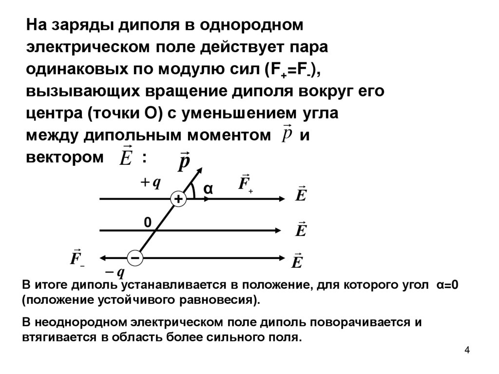 В итоге диполь устанавливается в положение, для которого угол α=0