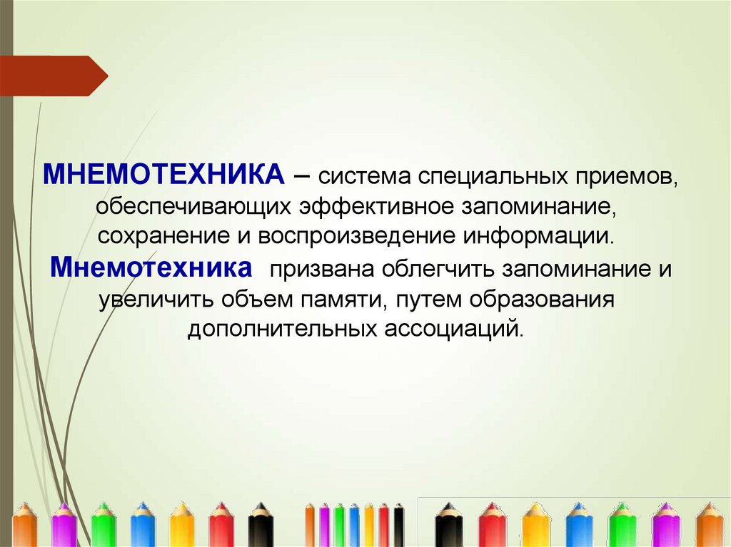 МНЕМОТЕХНИКА – система специальных приемов,обеспечивающих эффективное запоминание,