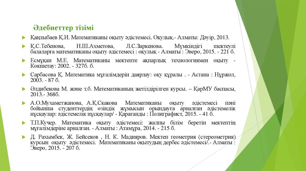 Әдебиеттер тізіміҚаңлыбаев Қ.И. Математиканы оқыту әдістемесі. Оқулық.- Алматы: Дәуір, 2013.
