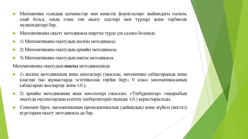 Математика «сандық қатынастар мен кеңістік формулалар» жайындағы ғылым,олай болса, оның өзіне тән оқыту әдістері мен түрлері және тәрбиелік