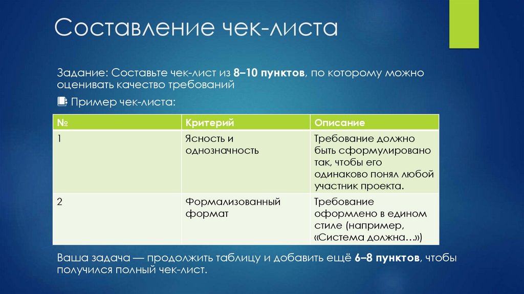 Составление чек-листаЗадание: Составьте чек-лист из 8–10 пунктов, по которому можно