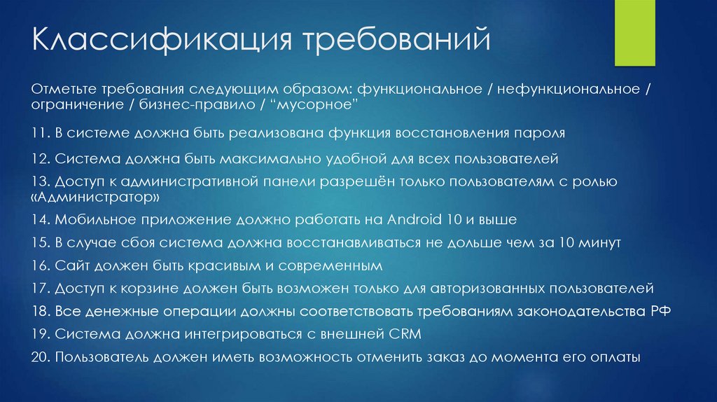 Отметьте требования следующим образом: функциональное / нефункциональное /ограничение / бизнес-правило / “мусорное”