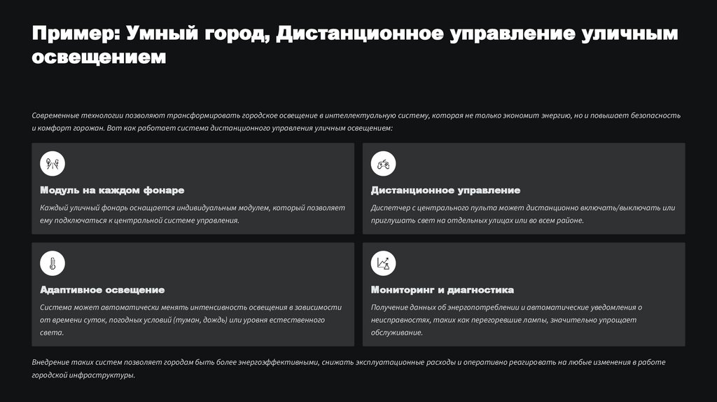 Внедрение таких систем позволяет городам быть более энергоэффективными, снижать эксплуатационные расходы и оперативно реагировать на любые изменения в работе