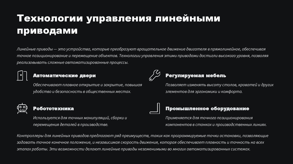 точное позиционирование и перемещение объектов. Технологии управления этими приводами достигли высокого уровня, позволяя