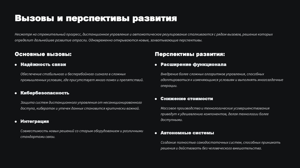 Вызовы и перспективы развитияНесмотря на стремительный прогресс, дистанционное управление и автоматическое регулирование сталкиваются с рядом вызовов, решение которых