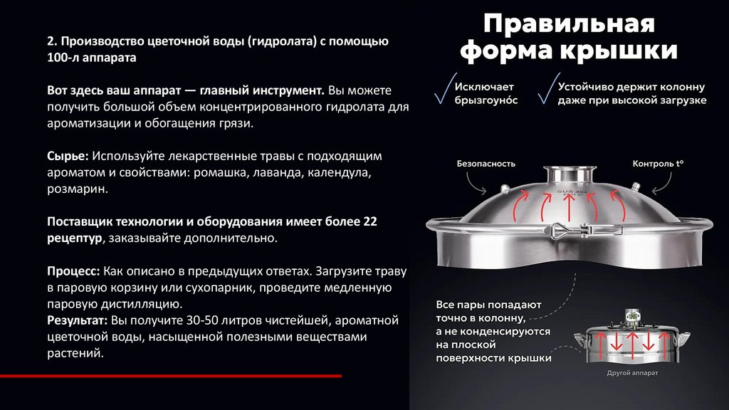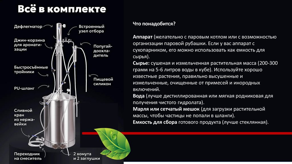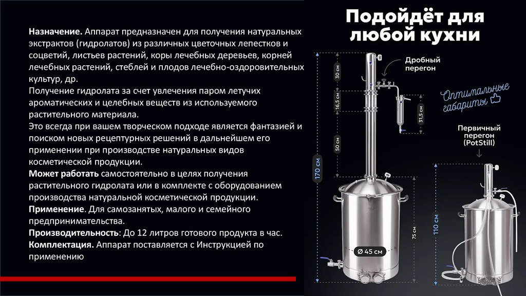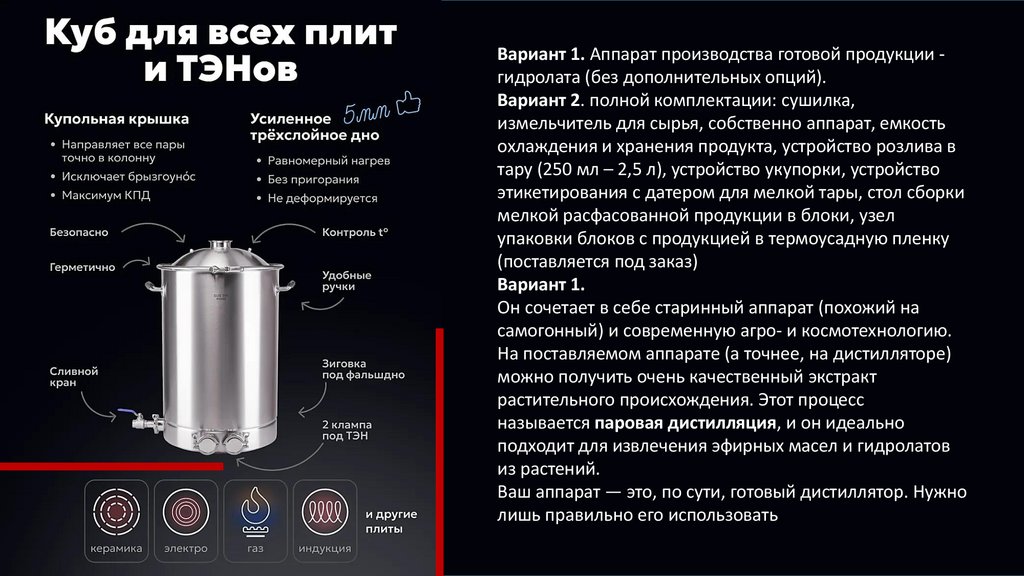Вариант 1. Аппарат производства готовой продукции гидролата (без дополнительных опций).Вариант 2. полной комплектации: сушилка,