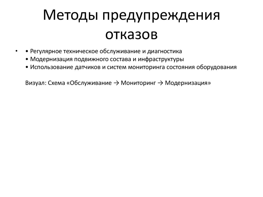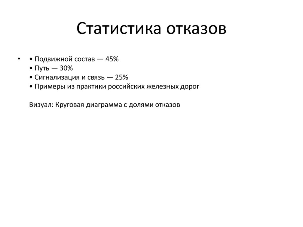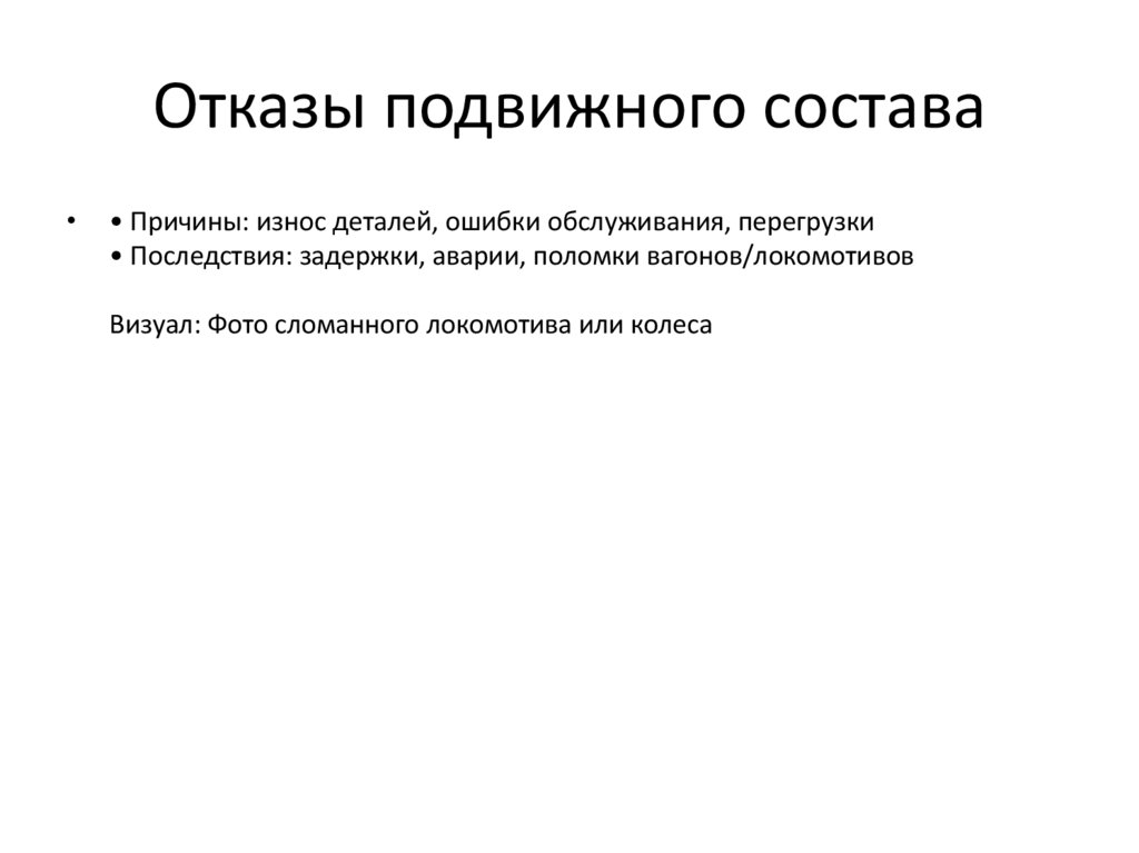Отказы подвижного состава• Причины: износ деталей, ошибки обслуживания, перегрузки
