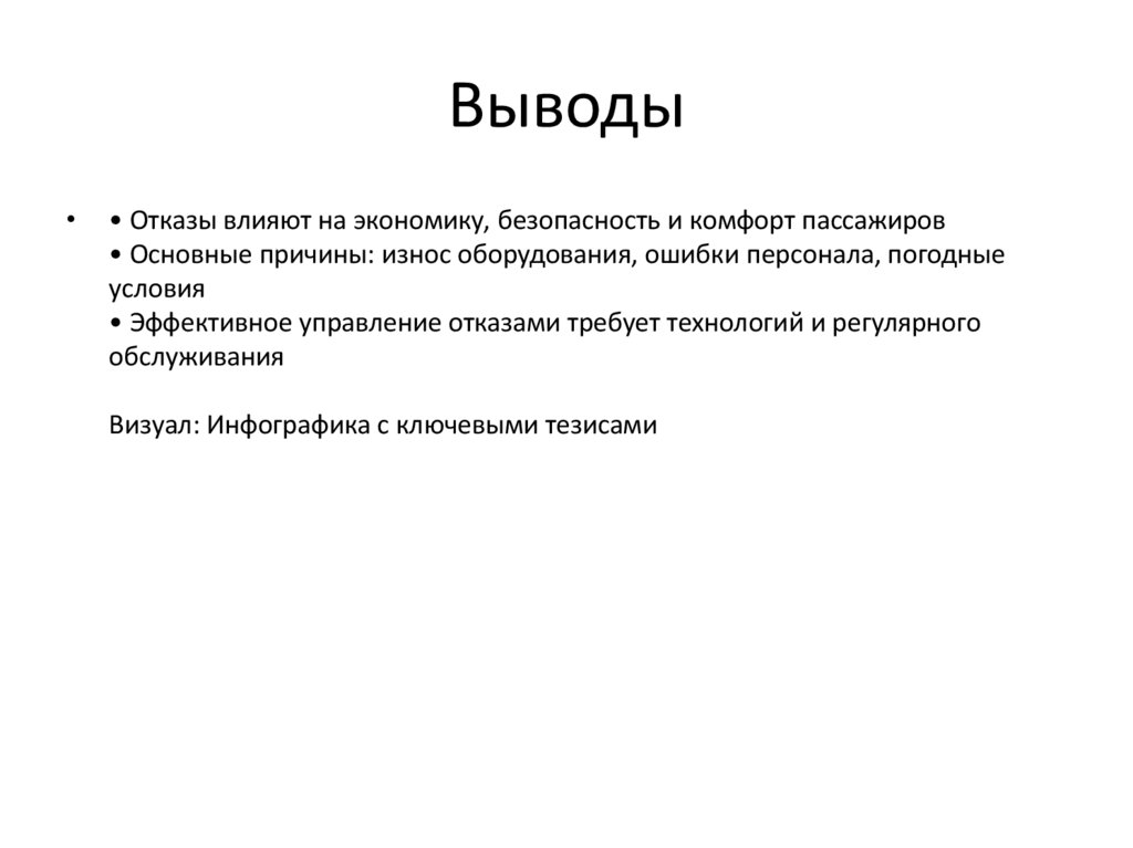 Выводы• Отказы влияют на экономику, безопасность и комфорт пассажиров