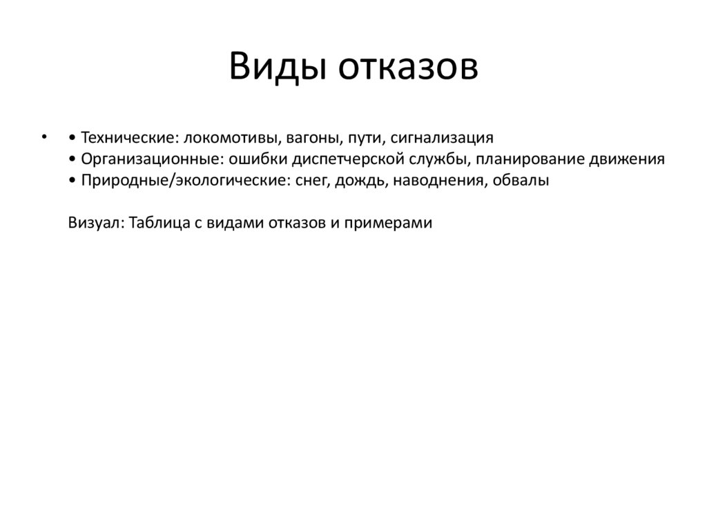 Виды отказов• Технические: локомотивы, вагоны, пути, сигнализация