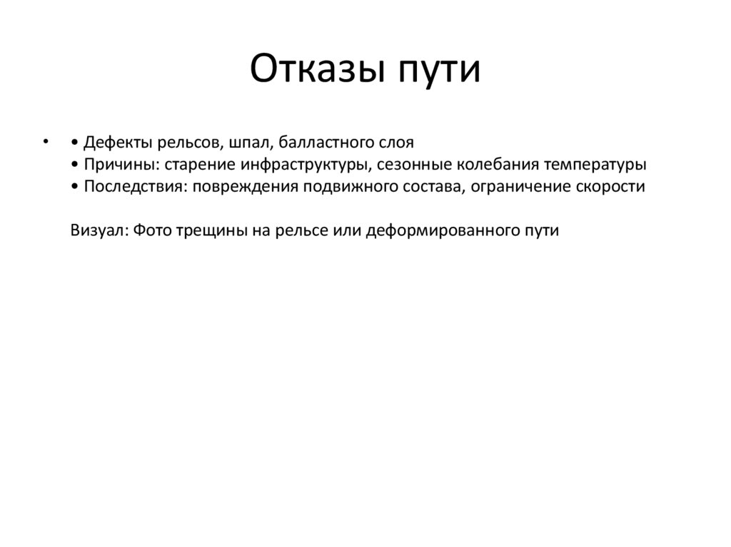 • Последствия: задержки, аварии, поломки вагонов/локомотивов