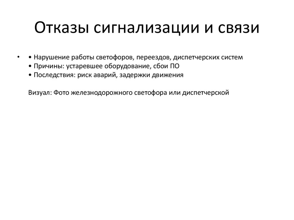 Отказы сигнализации и связи• Нарушение работы светофоров, переездов, диспетчерских систем
