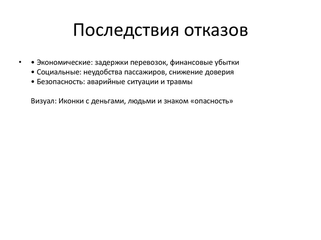 Последствия отказов• Экономические: задержки перевозок, финансовые убытки