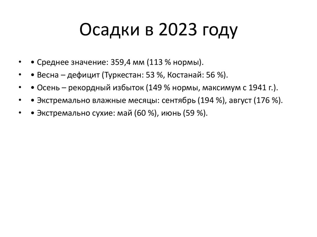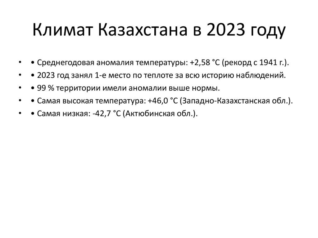 Климат Казахстана в 2023 году• Среднегодовая аномалия температуры: +2,58 °C (рекорд с 1941 г.).