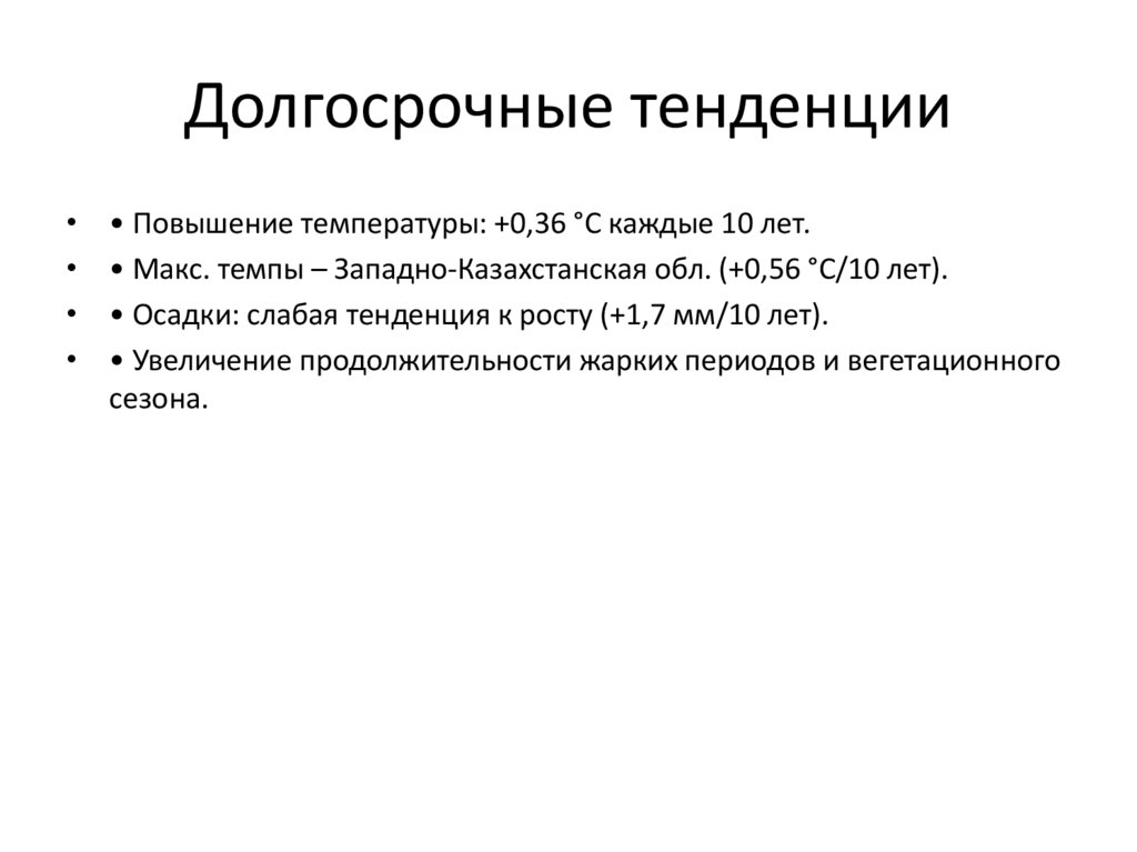 • Макс. темпы – Западно-Казахстанская обл. (+0,56 °C/10 лет).