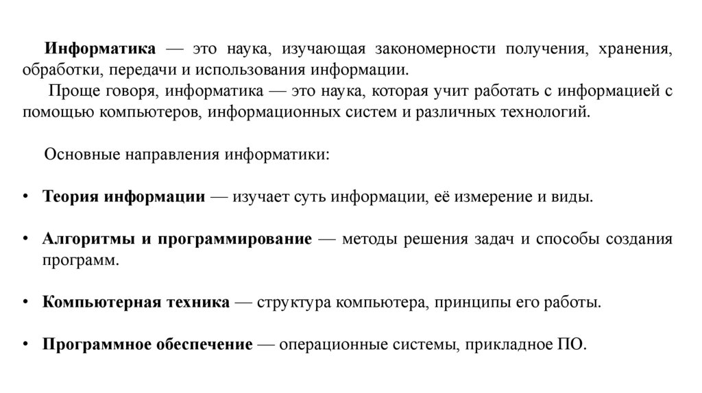 Информатика — это наука, изучающая закономерности получения, хранения,обработки, передачи и использования информации.
