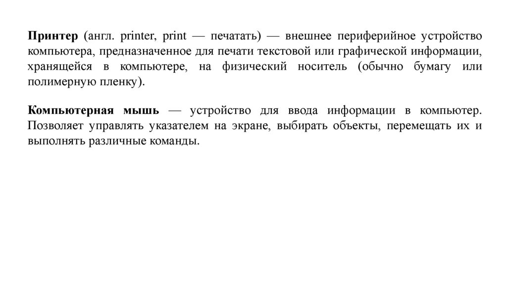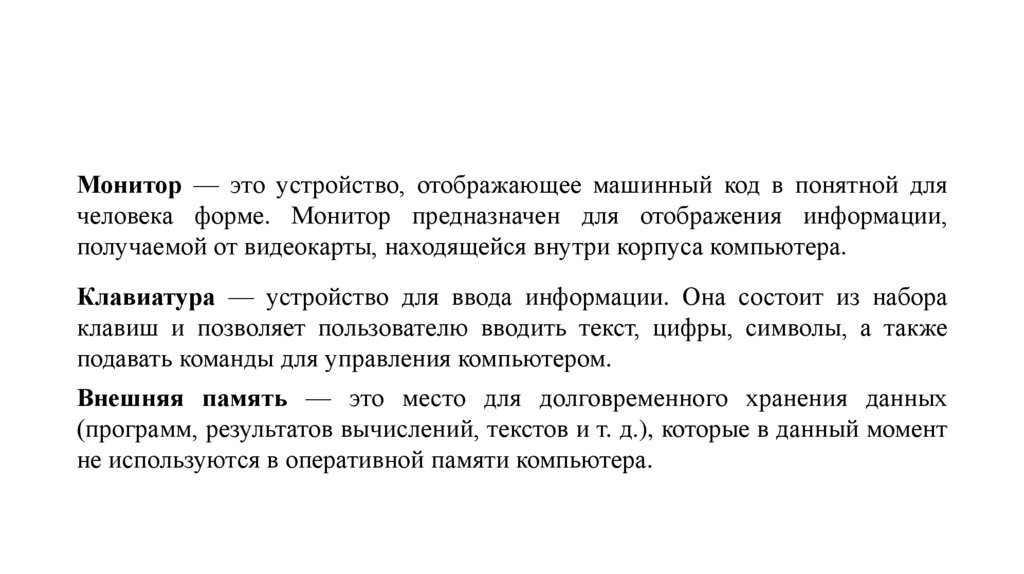 • Вывод информации — предоставление пользователю через монитор, принтер,