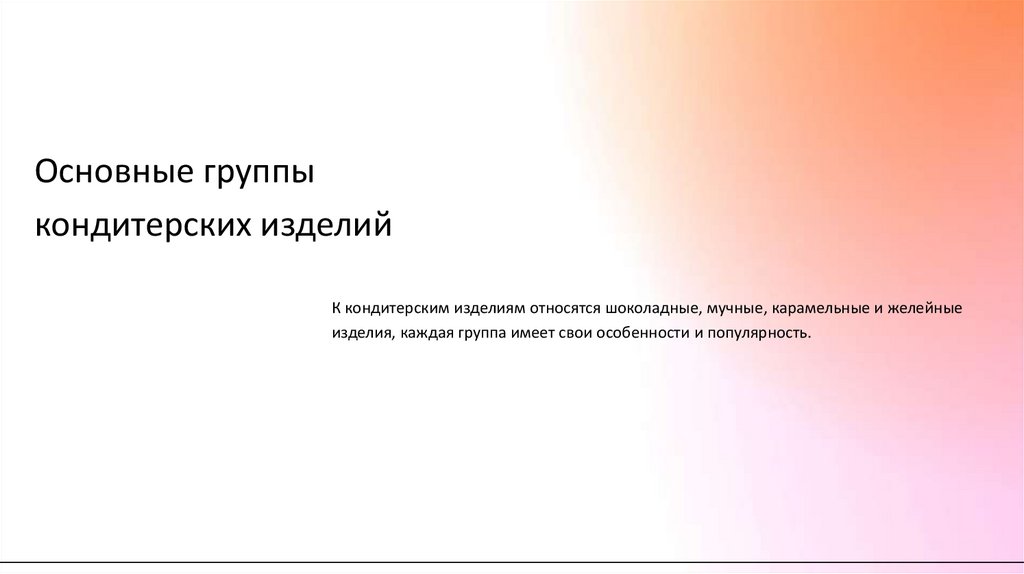 Кондитерские изделия разделяются на группы по составу и способу изготовления:
